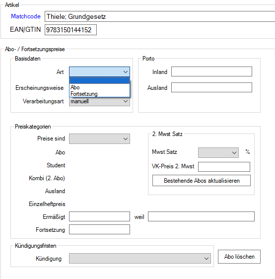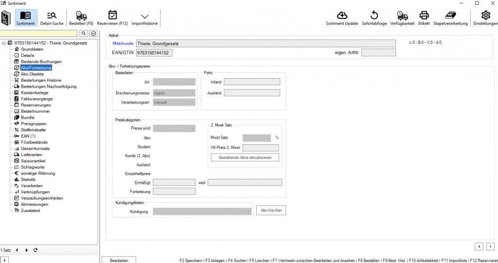 Bevor Abonnements oder Fortsetzungen verwaltet werden können, müssen die entsprechenden Artikel im Sortiment angelegt sein.