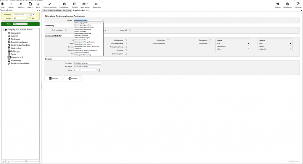 Klicken Sie auf das Dropdown-Feld neben „Drucke“ und wählen Sie die gewünschte Liste aus, z. B. „Rechnungsausgangsliste klein“.